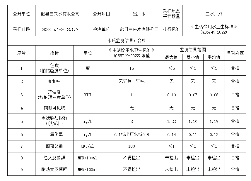 2023.5.1-2023.5.7出廠水質(zhì)信息公告