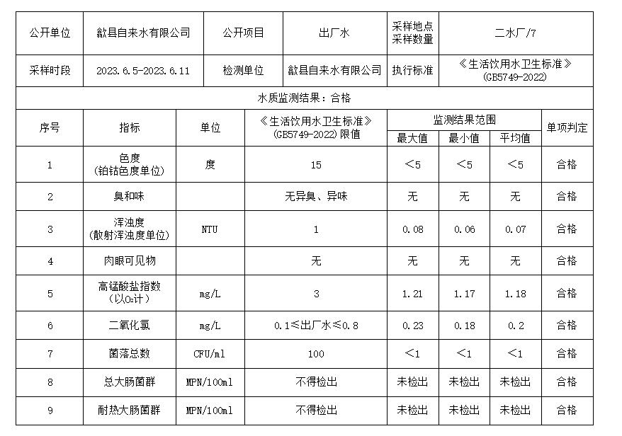 2023.6.5-2023.6.11出廠水質(zhì)信息公告