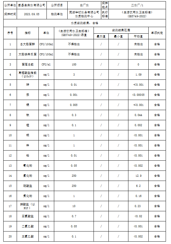 2023年9月出廠水水質(zhì)信息公告