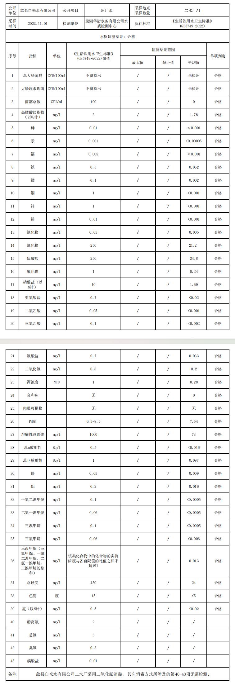 2023年11月出廠水水質(zhì)信息公告