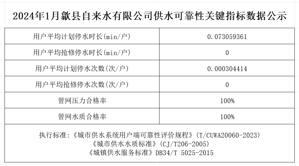 2024年1月歙縣自來水有限公司供水可靠性關(guān)鍵指標(biāo)數(shù)據(jù)公示