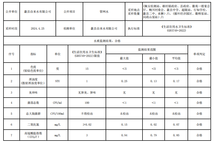 2024年4月下半月管網(wǎng)水水質(zhì)信息公告
