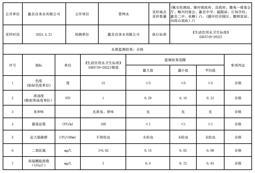 2024年5月下半月管網(wǎng)水水質(zhì)信息公告