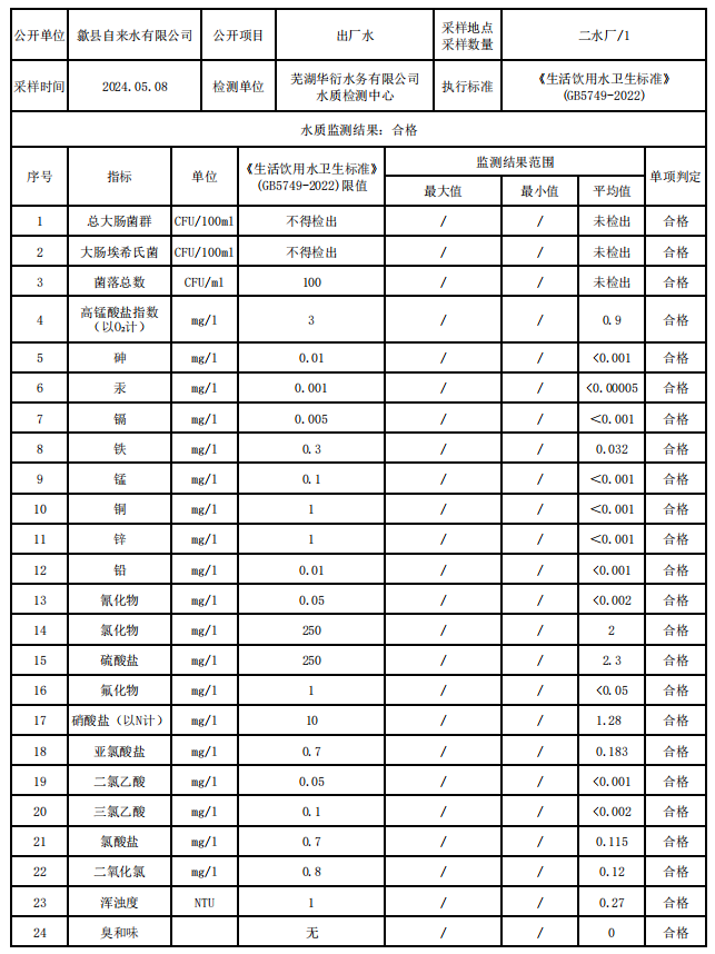 2024年5月出廠水水質(zhì)信息公告
