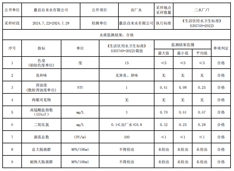 2024.7.22-2024.7.28出廠水質(zhì)信息公告