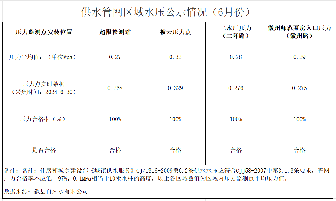 供水管網(wǎng)區(qū)域水壓公示情況(6月份)