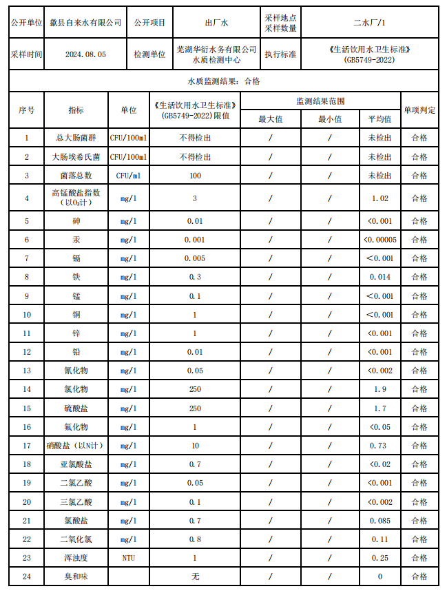 2024年8月出廠水水質(zhì)信息公告