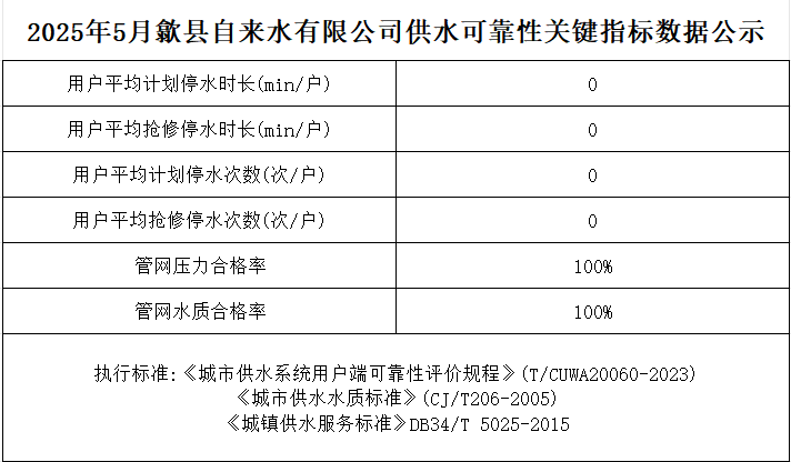 2025年5月歙縣自來(lái)水有限公司供水可靠性關(guān)鍵指標(biāo)數(shù)據(jù)公示