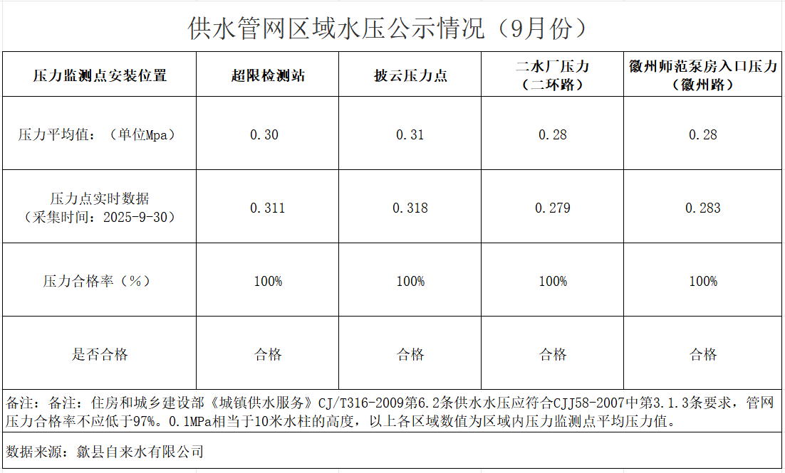 供水管網(wǎng)區(qū)域水壓公示情況(2025年9月份)