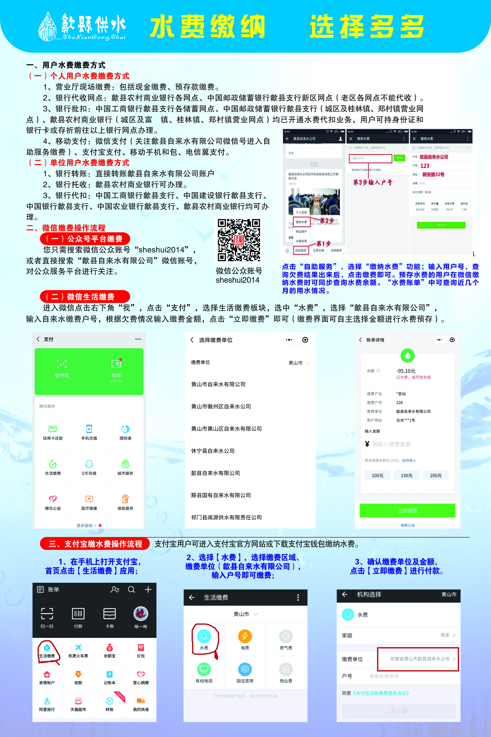 1.銀行轉(zhuǎn)賬:直接轉(zhuǎn)賬歙縣自來水有限公司賬戶