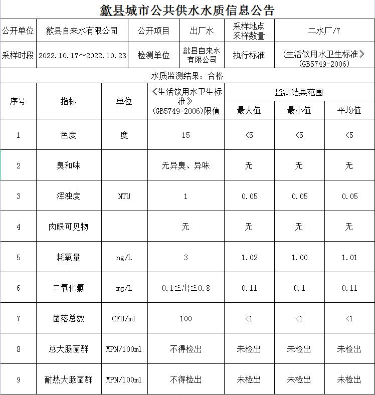 2022.10.17-2022.10.23出廠水質信息公告