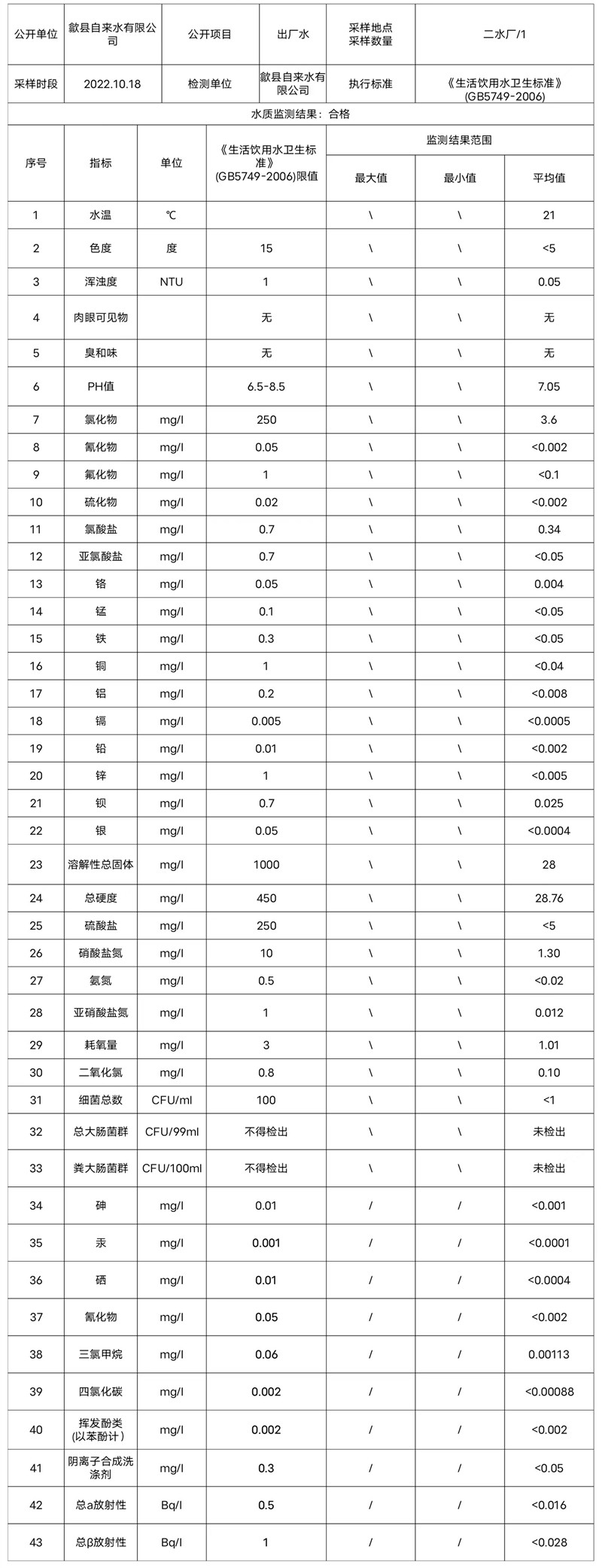 歙縣自來水有限公司2022年9月水質(zhì)報表