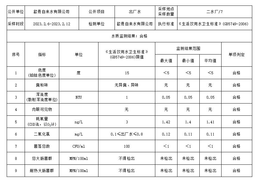 2023.2.6-2023.2.12出廠水質(zhì)信息公告