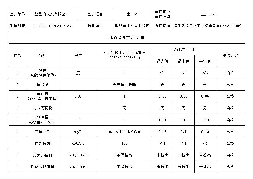 2023.2.20-2023.2.26出廠水質(zhì)信息公告