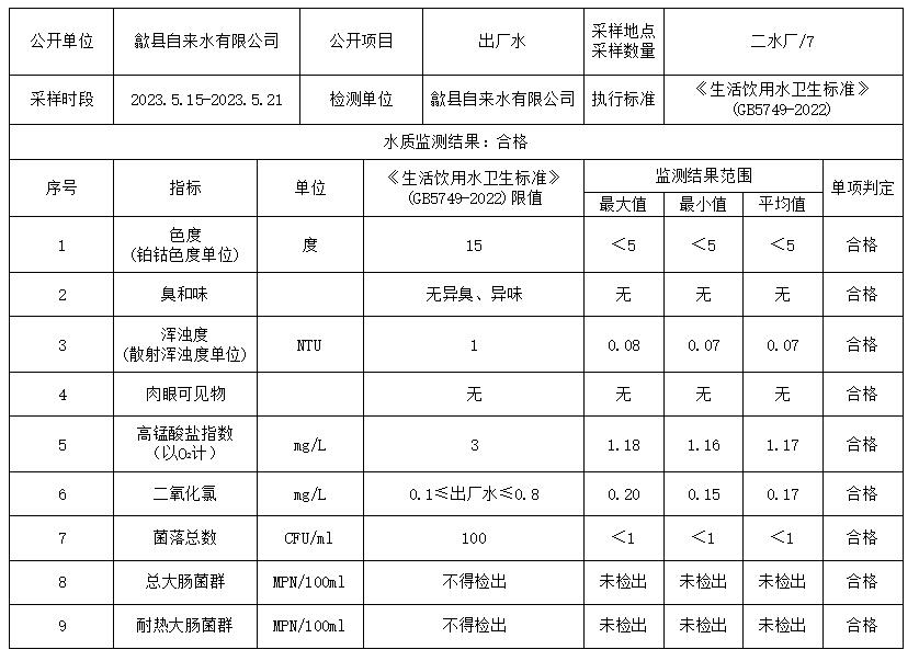 2023.5.15-2023.5.21出廠水質(zhì)信息公告