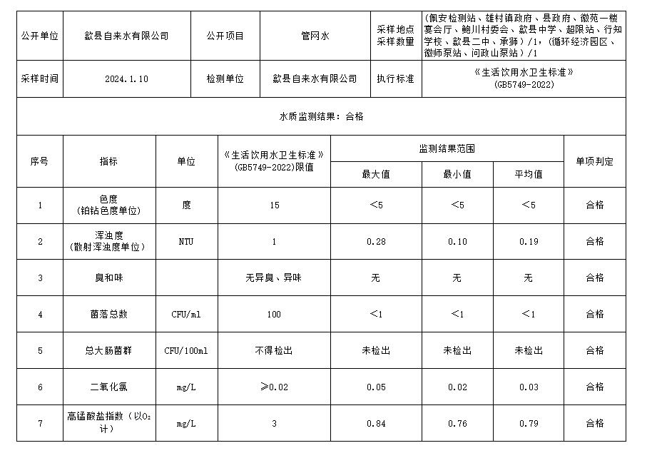 2024年1月上半月管網(wǎng)水水質(zhì)信息公告