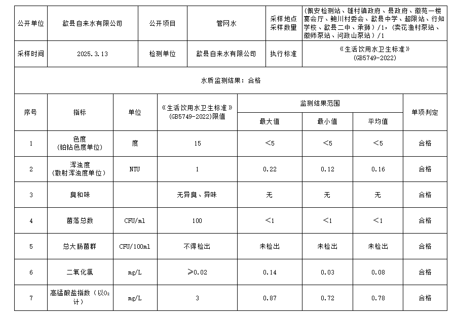2025年3月上半月管網(wǎng)水水質(zhì)信息公告