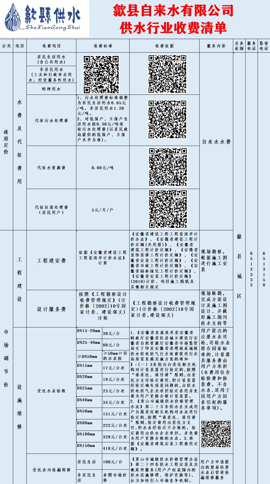歙縣自來水有限公司 供水行業(yè)收費清單