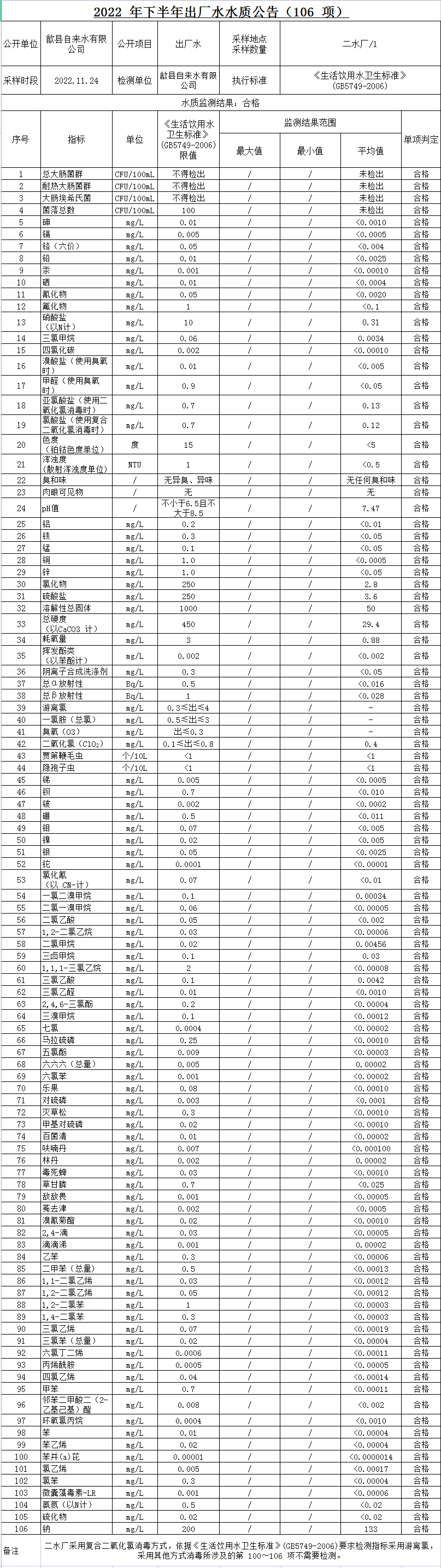 2022 年下半年出廠水水質(zhì)公告(106 項(xiàng))