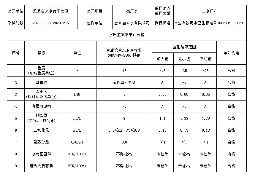2023.1.30-2023.2.5出廠水質(zhì)信息公告
